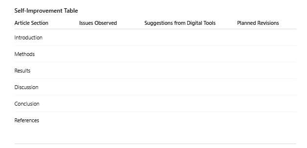 In this final stage of the IMPROVE phase, students revise their articles based on self-evaluation, class discussion, and digital tool feedback. The focus is on improving clarity, coherence, argumentation, structure, and referencing throughout the article. After making revisions, students produce a polished, complete draft. This draft will then be evaluated using ChatGPT, which provides suggestions on overall quality, logical flow, language accuracy, and readability. The goal is to ensure the article is well-prepared, academically sound, and ready for submission or the next stage of the learning process.